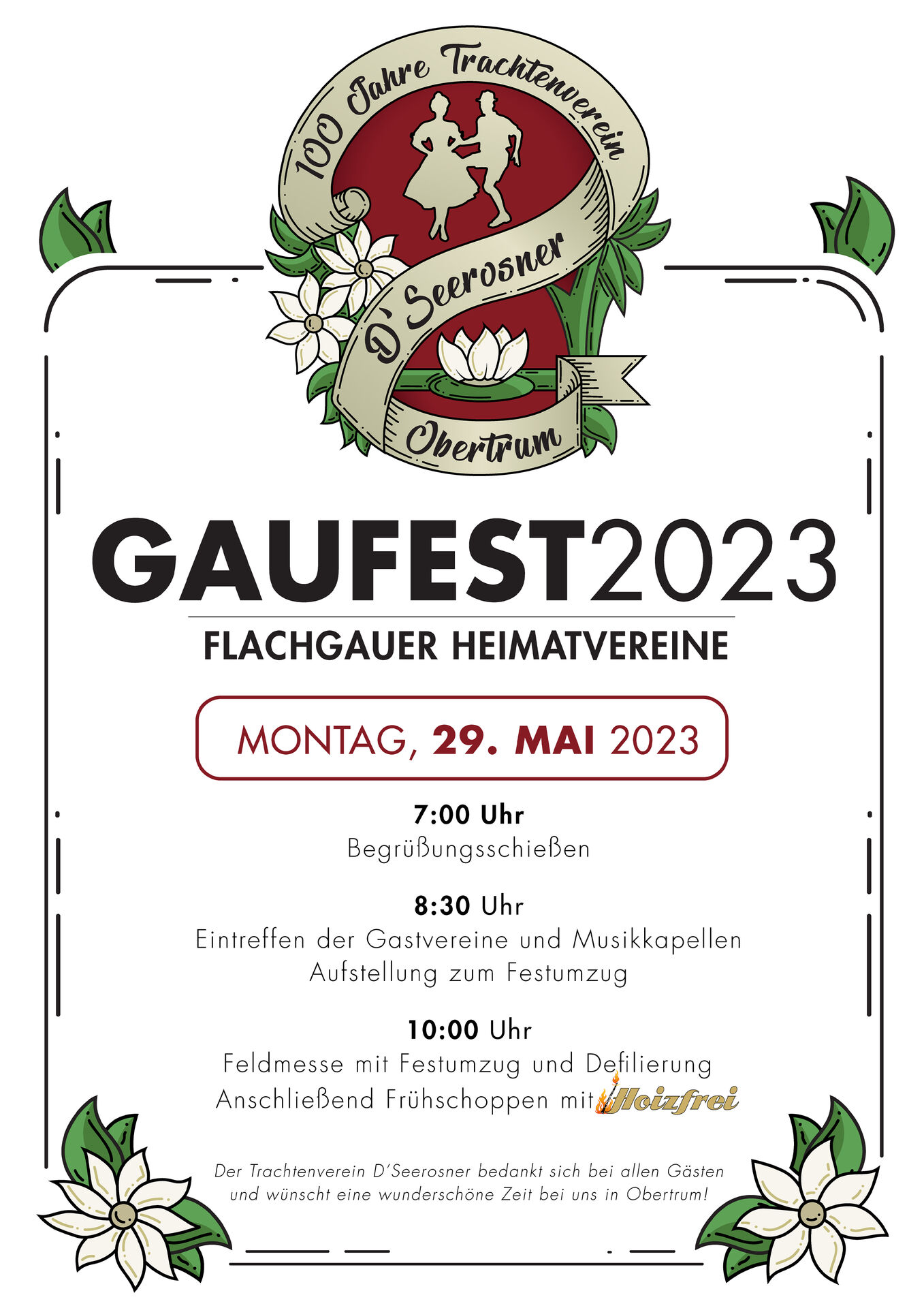 Am Montag, den 29.05.2023 (Pfingstmontag) findet in Obertrum am See das Gaufest der Flachgauer Heimatvereine sowie das 100jährige Bestandsjubiläum des Trachtenverein D'Seerosner statt.
