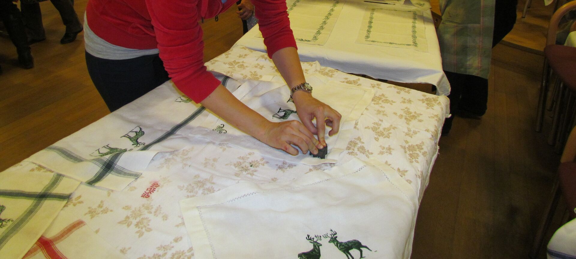 Bitte mitbringen: alte Woll- od. Vliesdecke, alter Polsterüberzug, Zeitungen, Schürze, Lineal od. Maßband, Bleistift, Schere, gewaschene Stoffe zum Bedrucken.